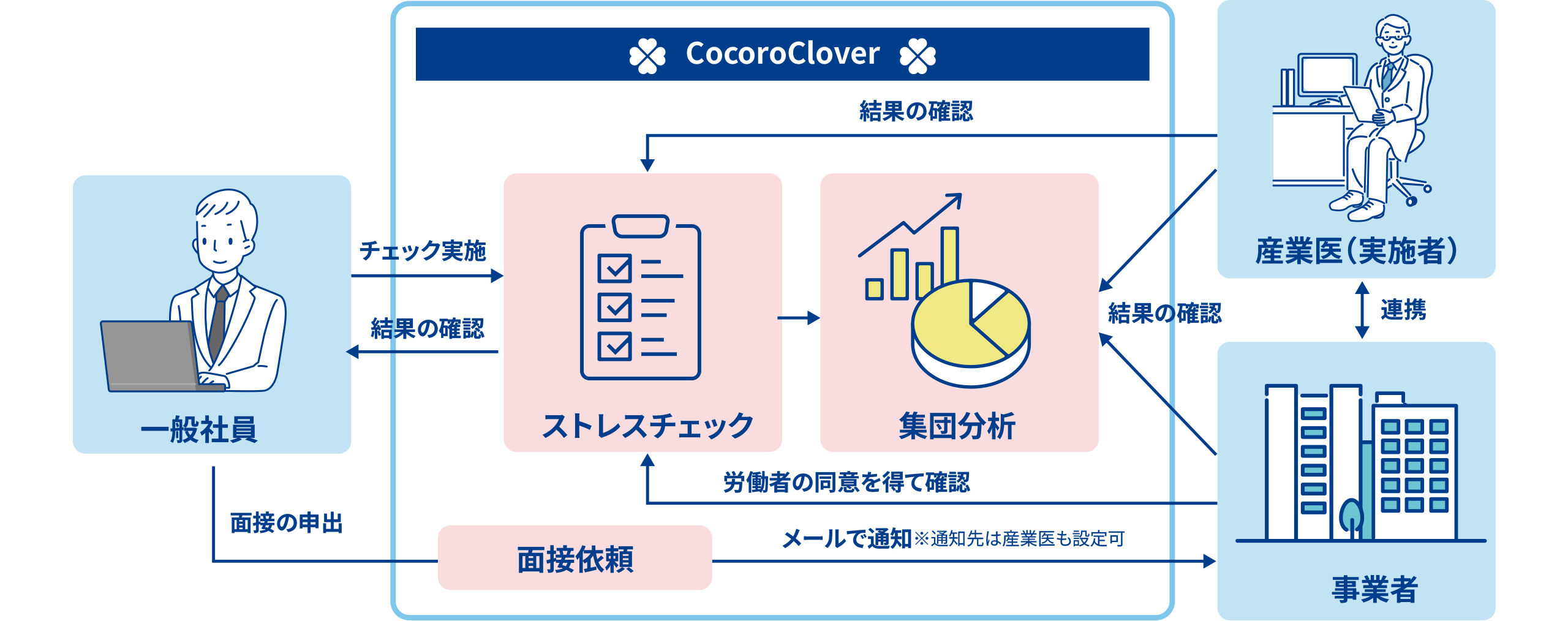 高ストレス者から面接の申出があった場合、CocoroCloverから面接依頼ができ、事業者または実施者宛てにメールが送信されます。