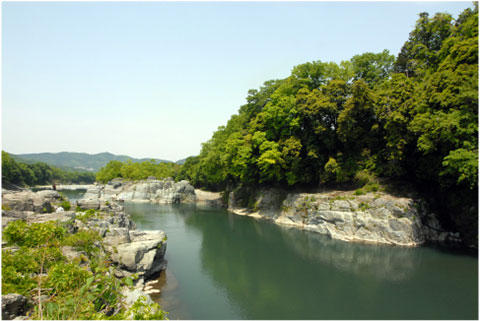 駅を出て左後方の石段を降りて行くと、せせらぎの音が聞こえてくるとともに視界が開け、一面に長瀞渓谷が見渡せます。美しい岩畳は、地下 2、30 キロメートルで作られた結晶片岩が隆起し川の流れに磨かれてできたもので、地質学的にも重要な研究対象とされてきました。
