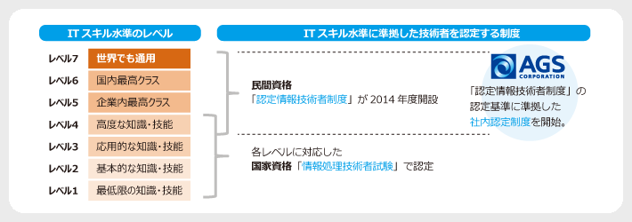AGSグループでは、IT ソリューション能力が高く高度な専門知識と豊富な業務実績を有する技術者の育成をめざし、国家標準規格に則った