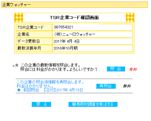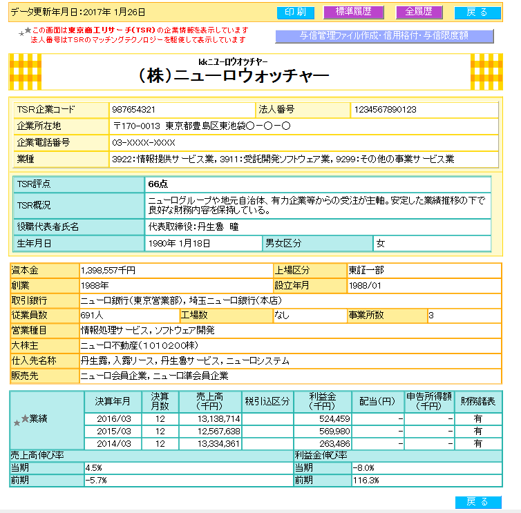 取引先企業の基本情報や業務内容の概要を参照する事が出来ます。履歴表示により業績については過去5期分、一部項目については過去3年分の履歴の表示も可能です。