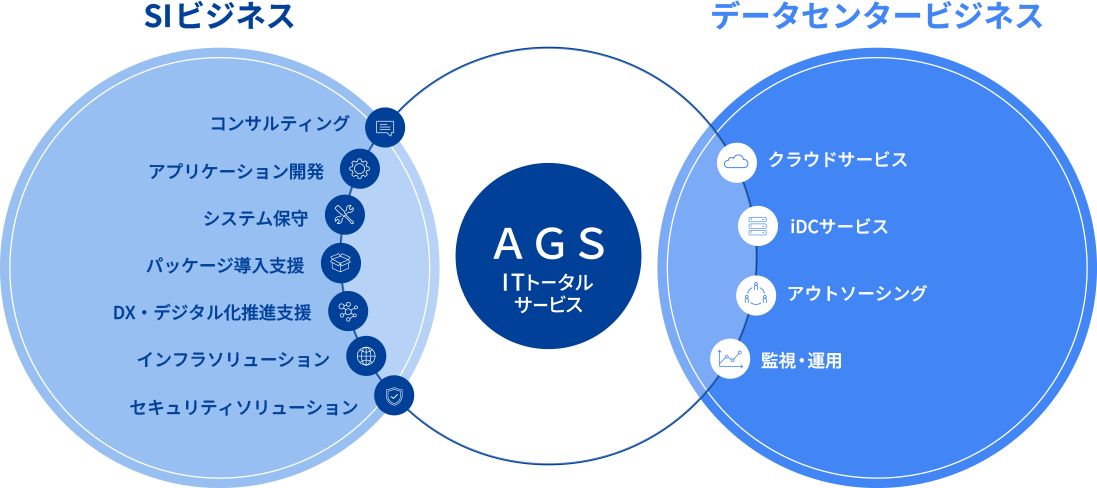 エンジニア・営業でソリューションを提案・設計・開発するSIビジネスを成長エンジンとし、最先端の自社データセンター等を活用した情報処理サービスを主要事業としています。これにより、コンサルティングから開発・保守運用までを一体的に、柔軟かつスピーディーに提供する「AGSワンストップサービス」を実現しています。これは特定のフェーズ、仕事内容に偏らずお客様のビジネス全体をサポートできるということです。さらに、『金融・公共・法人と幅広い業界に向けてサービスを提供する』『顧客密着を重視し、付加価値の高いサービスを提供する』といった特徴とあわせて、AGSは安定した力強い経営を実現しています。そして、社員が働くうえでも、様々な分野で活躍し、お客様のビジネス全体を支える/変えていく仕事を行うことができる会社となっています。