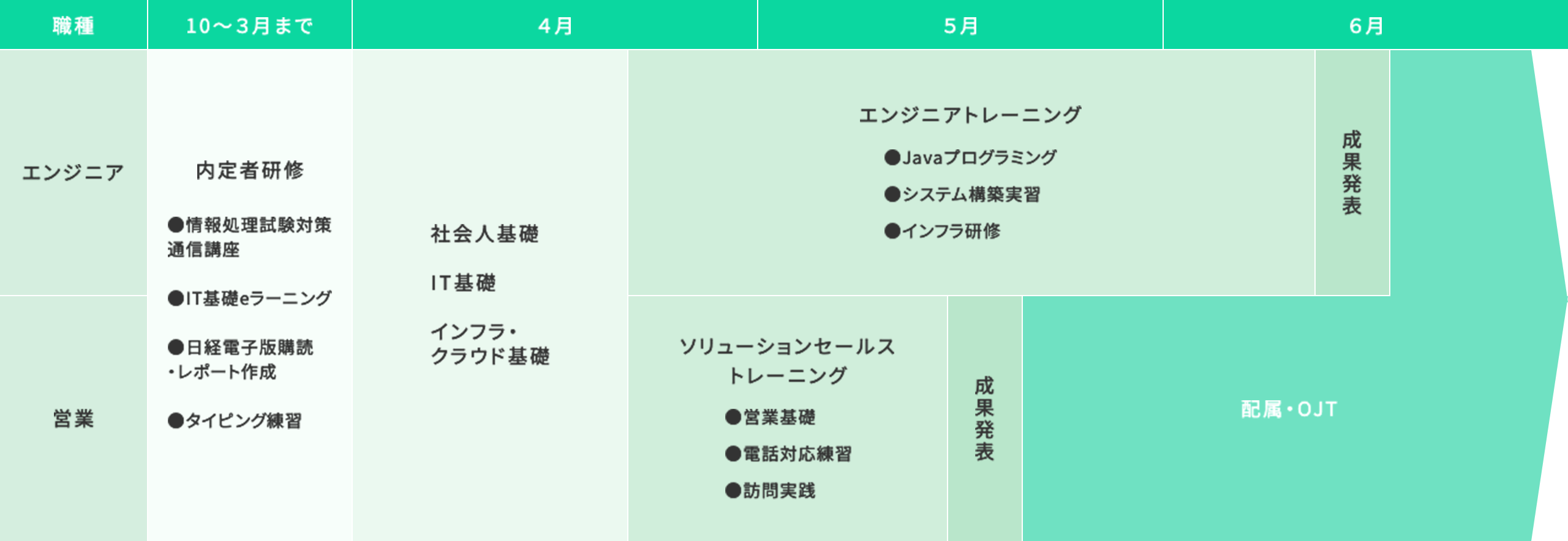 社会人の基礎となるマナーや常識、ITの基本的な知識を学ぶことから始まり、チームで課題をこなすことによりコミュニケーション能力上昇も目指します。5月からは希望職種ごとに分かれ、エンジニア職志望はプログラミング構築実習、営業職志望は営業の基礎、電話応対などを配属に向けて学んでいきます。