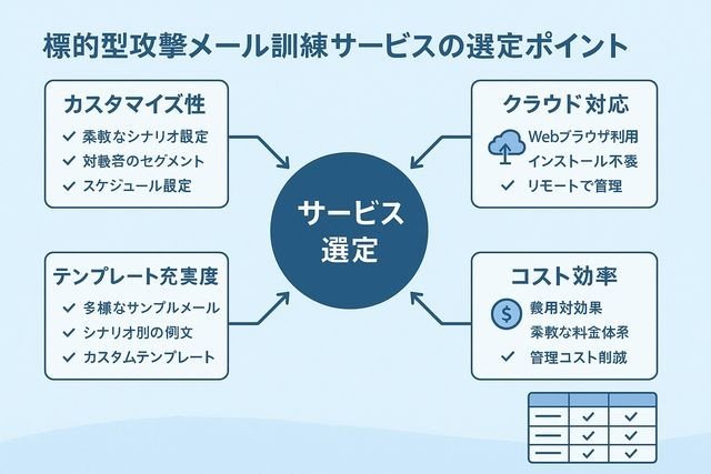 標的型攻撃メール訓練サービスの選び方において重要なのは、カスタマイズ性、クラウド対応、豊富なテンプレート、そして継続可能なコスト構造の4つのポイントです。自社のニーズと予算に合った適切なサービスを選定することで、効果的かつ持続可能な訓練体制を構築できます。