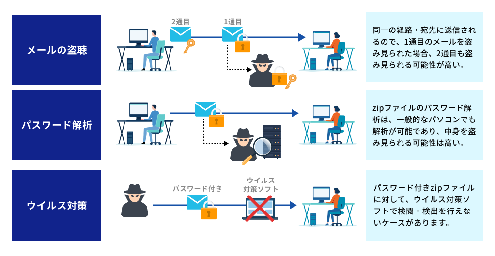 パスワード付きzipファイルとパスワードをそれぞれ別々のメールで送信するファイル送信手段(PPAP)は、以下の様なセキュリティリスクを抱えており、廃止への動きが活発になってきています。