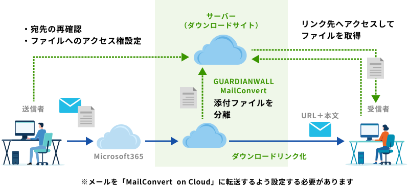 メールにファイルを添付し送信すると、「MailConvert on Cloud」上で、自動的にファイルを分離・ダウンロードサイトへアップロードが行われ、ダウンロードURLがメール本文に挿入されます。万一送り先を誤った場合は、ダウンロードサイト上でリンクを無効化することで、漏洩を防止できます。また、ポリシーの設定は、「MailConvert on Cloud」上で一括管理することができます。