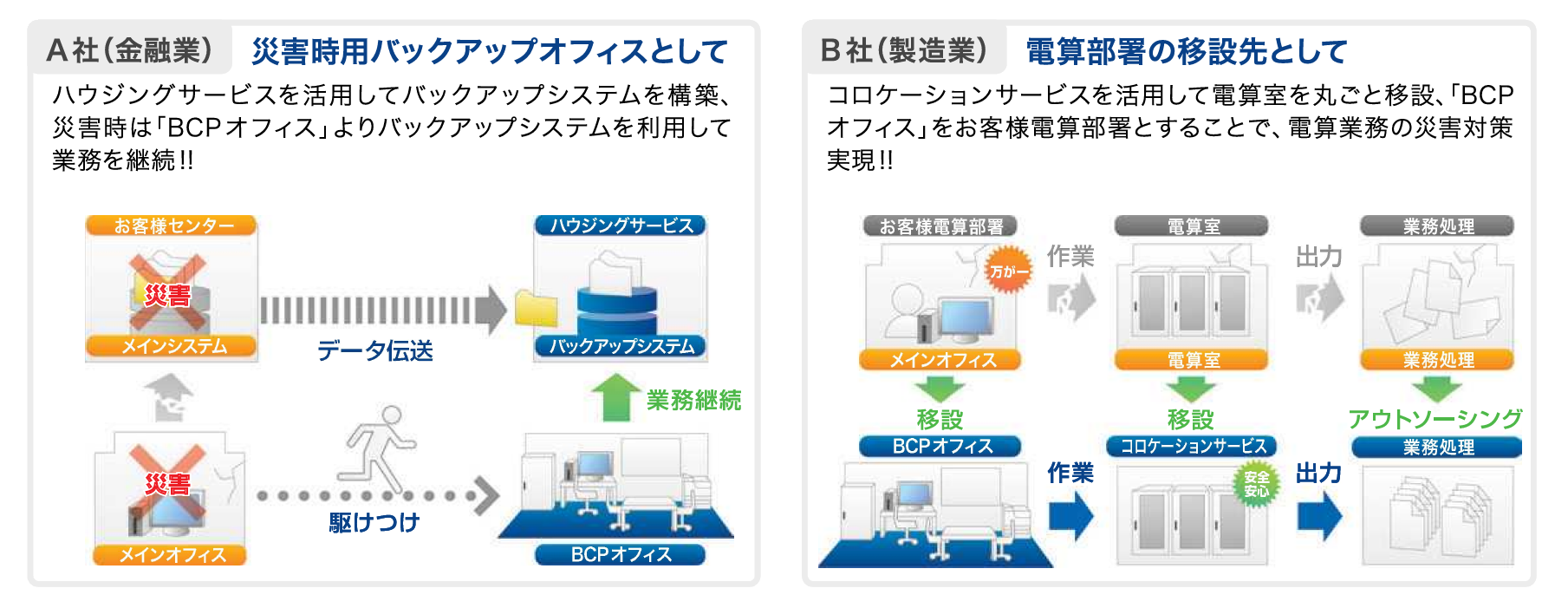 - ハウジングサービスを活用して災害時はバックアップオフィスとして利用し、業務を継続できます。