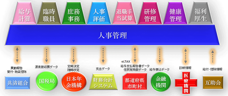 - 人事給与関連業務を総合的に支援することを目指したトータルパッケージシステムです。