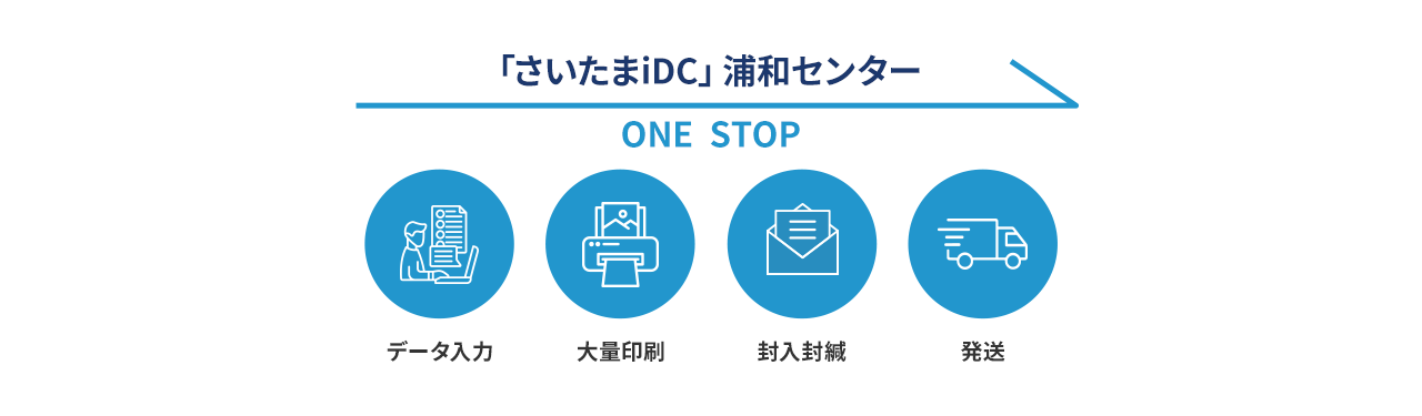 安全なデータセンターの建物内にて一貫してデータ入力・大量印刷・封入封緘・発送までワンストップで提供いたします。