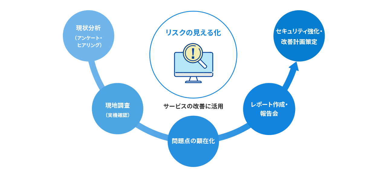 お客さまのインフラ環境(サーバー、ネットワーク、セキュリティ機器など)に対して、アンケート、ヒアリング、実機による現地調査を実施します。お客さまの環境に潜んでいる稼働上の問題点や潜在的な脆弱性を客観的な視点で見える化し、改善すべきポイントを明確にします。