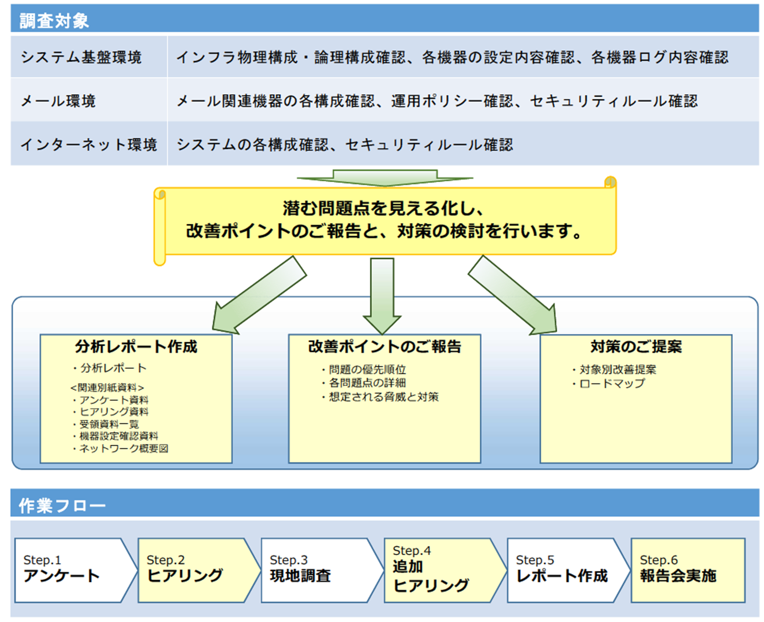 お客様システム環境に対して調査・評価を実施し、問題点の顕在化をおこないます。