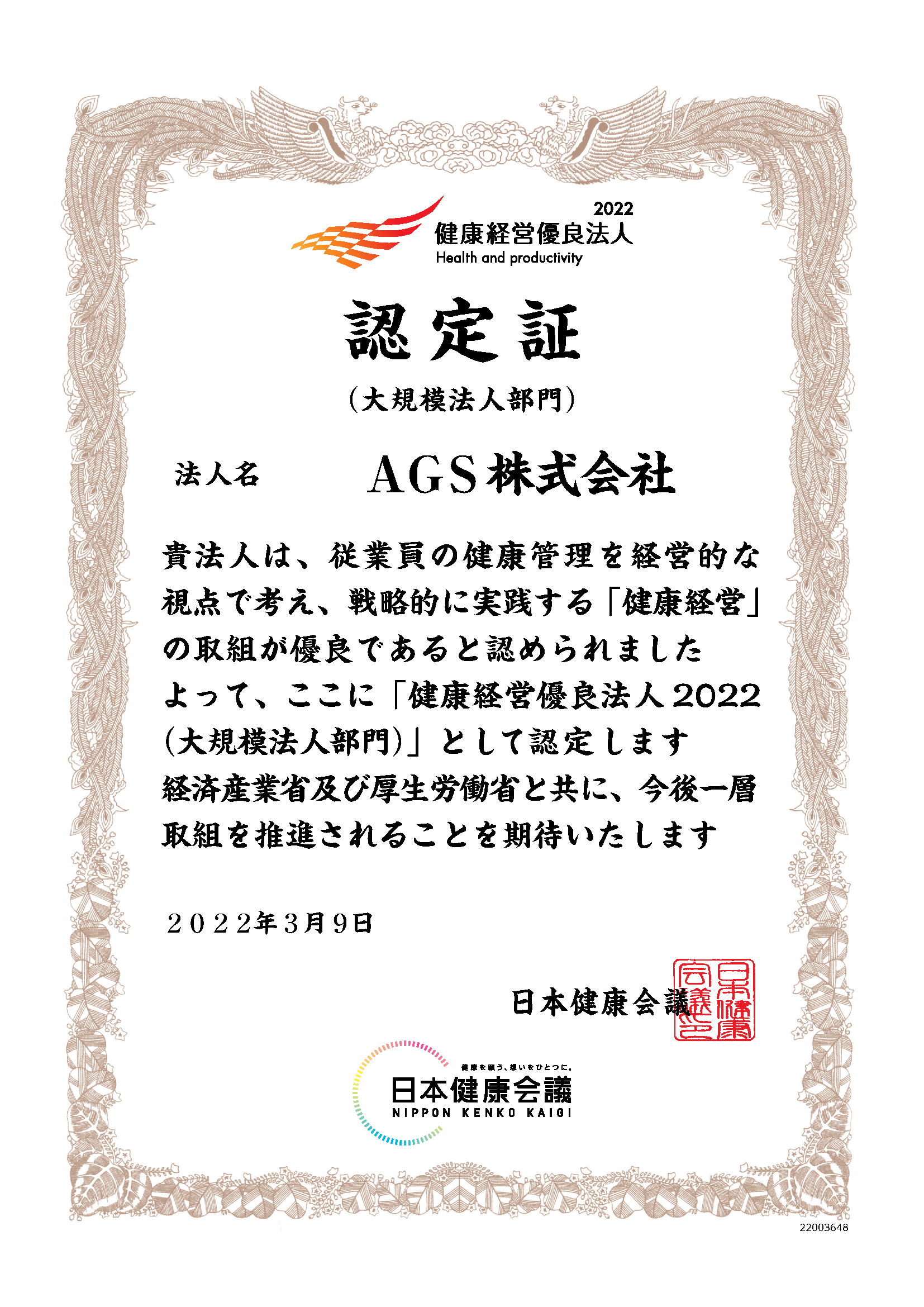 AGS株式会社(本社:埼玉県さいたま市、代表取締役社長:原 俊樹、以下当社)は、経済産業省と日本健康会議が共同で実施する「健康経営優良法人2022(大規模法人部門)」に認定されましたのでお知らせいたします。