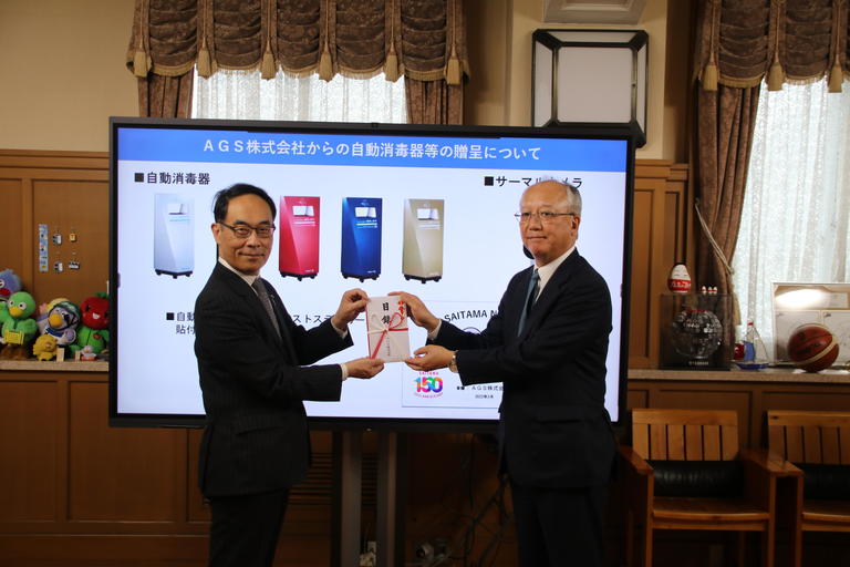 AGS株式会社(本社:埼玉県さいたま市、代表取締役社長:原 俊樹、以下当社)は、「埼玉150周年記念事業パートナー」として、また「グループ創立50周年記念事業」の一環として、埼玉県向けに2022年3月28日、高速自動消毒器(手指消毒ディスペンサー)6台、専用除菌液12本、サーマルカメラ(顔認証+自動検温システム)6台の寄附を実施いたしました。